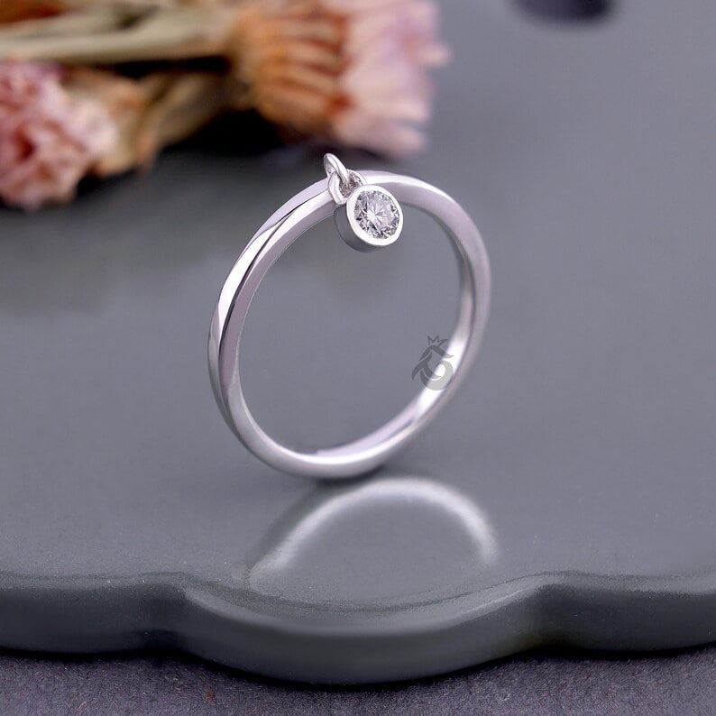 This 0.10CT Round Cut Moissanite Solitaire Engagement Ring is a dainty and elegant piece designed for those who love simplicity with a unique twist. Featuring a bare-set, free-floating Moissanite diamond, the ring is accented with a delicate dangling charm that adds soft movement and sparkle with every touch. Its minimalist yet eye-catching design makes it perfect for daily wear, while also serving as a meaningful promise ring, engagement ring, or a thoughtful anniversary gift that carries a hint of playful charm.