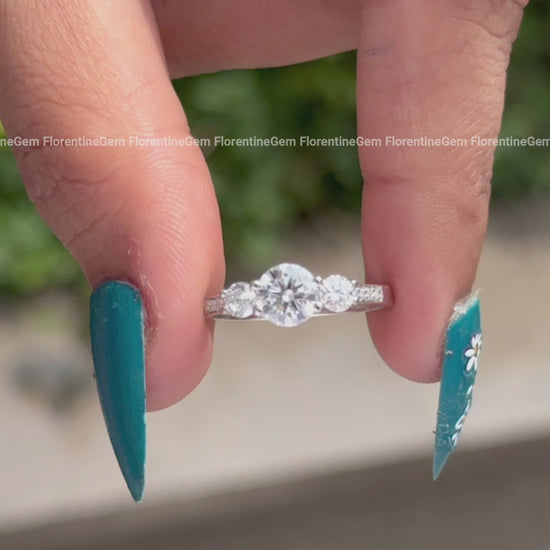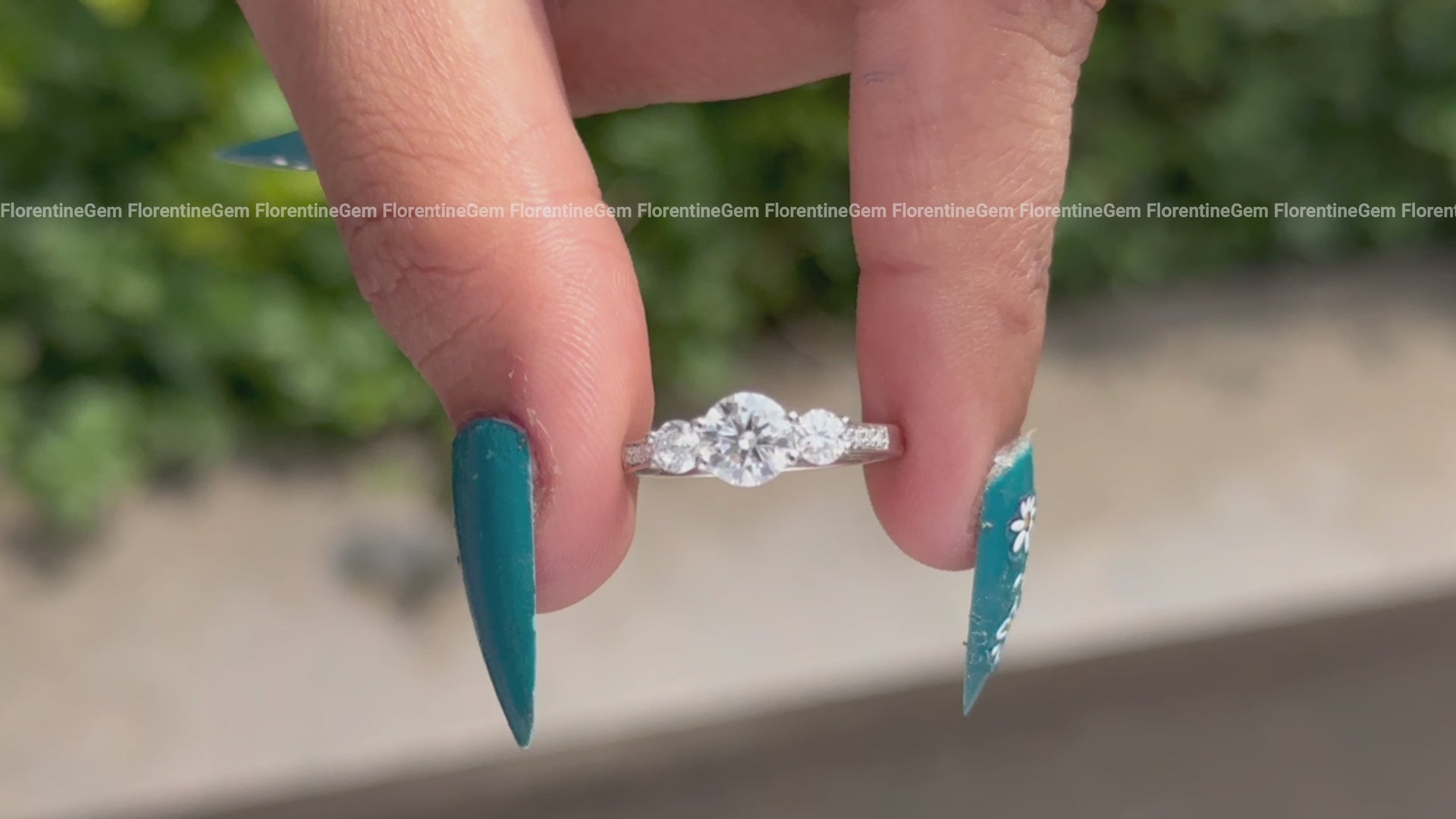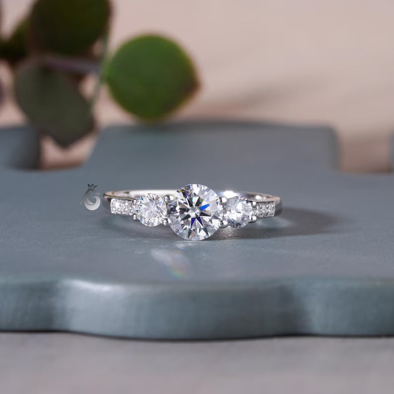 1.10CT Round Moissanite Three-Stone Ring, Side Stones, 14K White Gold