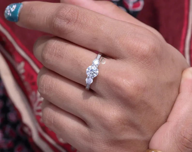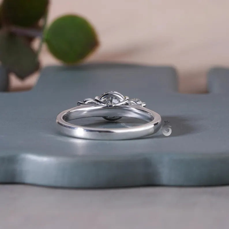 This 14K white gold three-stone engagement ring features a beautiful 1.10 carat brilliant round-cut moissanite centerpiece, symbolizing a "Past, Present, and Future" theme. The central stone is flanked by two slightly smaller moissanites, emphasizing the special moments you share. Side stones set along the delicate, dainty band add extra sparkle without overpowering the classic design, making it ideal for those who appreciate elegance and subtlety. Perfect as a promise ring, engagement ring, or anniversary gift, this ring is a stunning testament to love and commitment, crafted to endure and cherish for years to come.