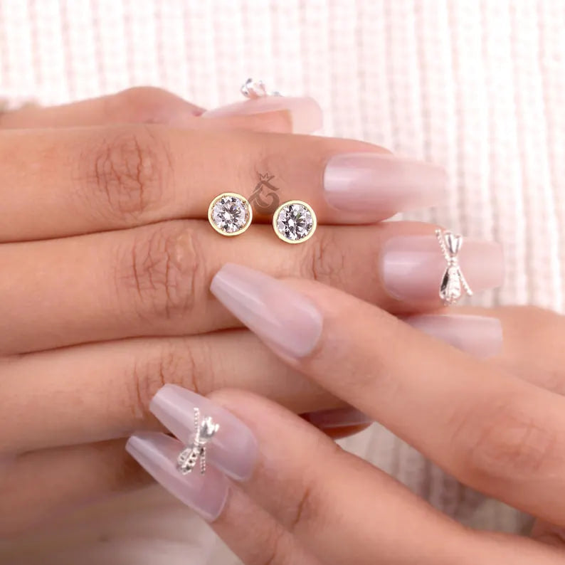 These 1.30 TCW round cut colorless moissanite earrings feature a sleek bezel setting for a clean, modern look. Designed with secure screw backs, they’re ideal for daily wear or bridal occasions. Their radiant sparkle adds elegance to weddings, anniversaries, or everyday moments. These timeless studs are perfect for gifting or completing a bridal look.