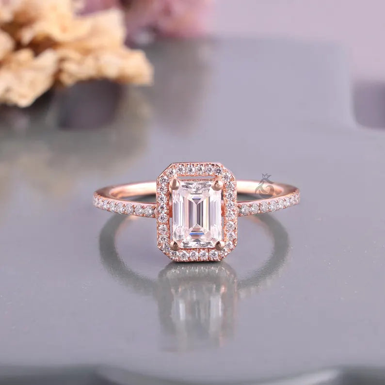 1 CT Emerald Cut Moissanite Halo Engagement Ring, Pave Diamond Bridal Ring, 14K Rose Gold