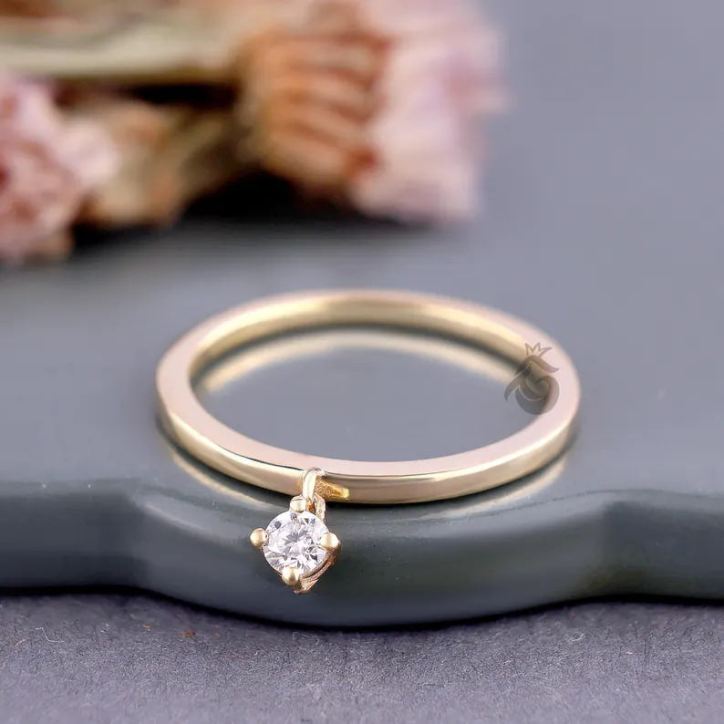 14K Yellow Gold Moissanite Dangle Charm Ring, Minimalist Stacking Solitaire Ring