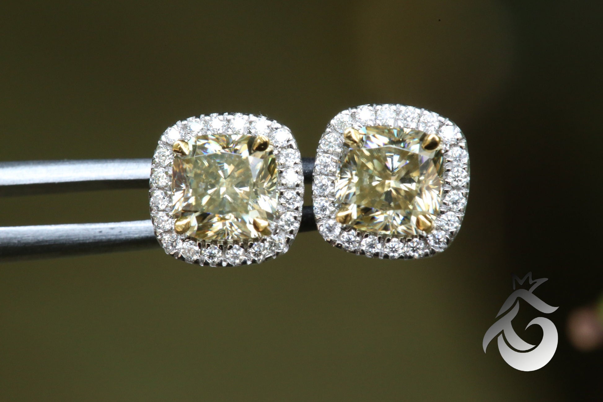 1CT Cushion Cut Canary Yellow Moissanite Halo Stud Earrings – 14K Gold Bridal Jewelry