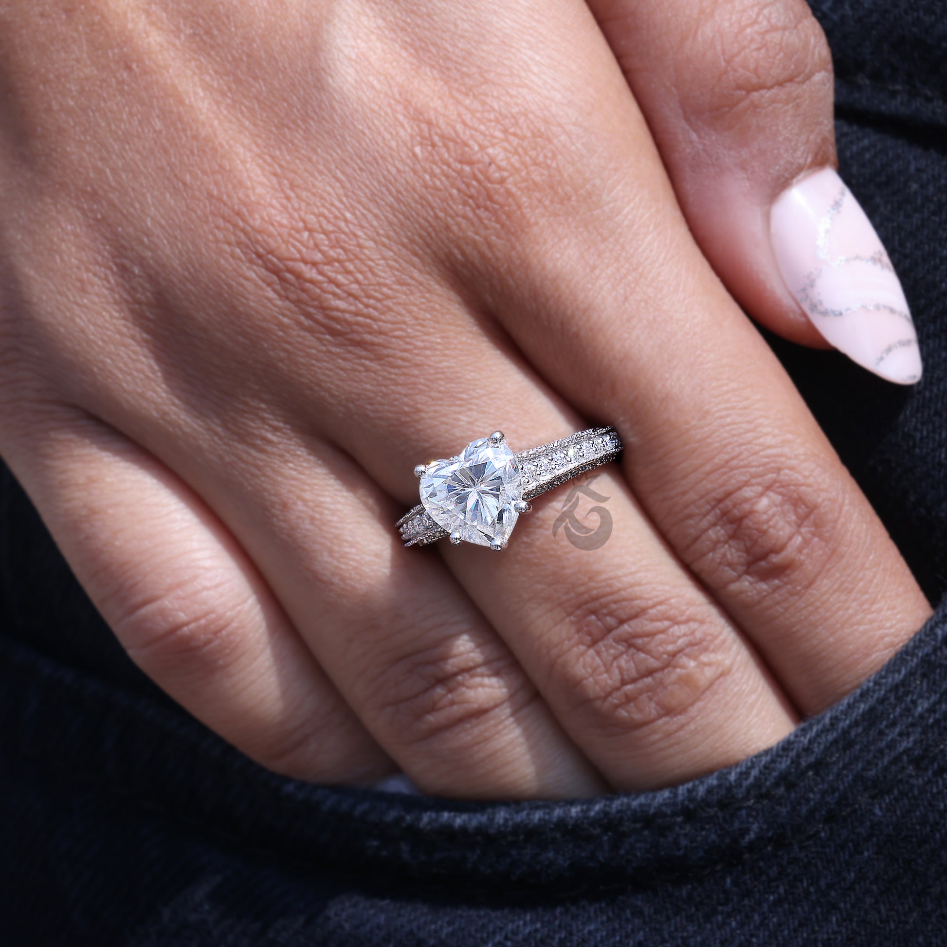 This stunning 2.58 CT Heart Cut Moissanite Engagement Ring is designed to capture the essence of romance and elegance. The heart-shaped moissanite sparkles brilliantly, set in a three-sided pave setting that enhances its brilliance from every angle. Crafted in 14k white gold, this ring features intricate Mil grain detailing, adding a touch of vintage charm. The combination of fine craftsmanship and timeless design makes it an ideal choice for engagements, proposals, or a meaningful promise ring.