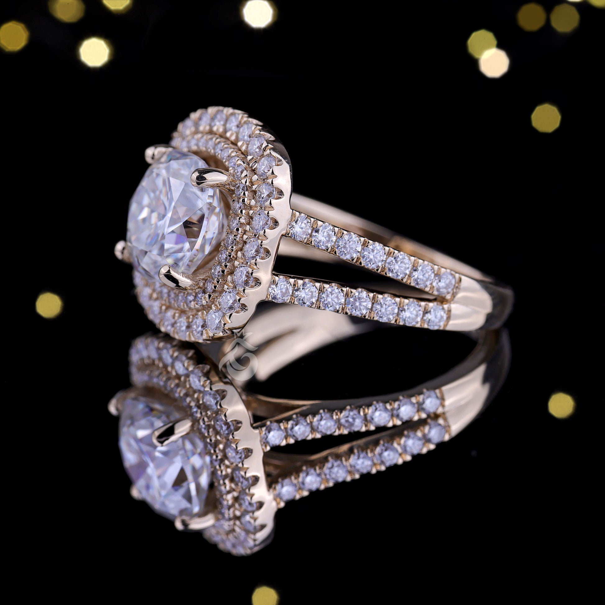 2.65 TW Cushion & Round Moissanite Halo Ring – 14K Gold Split Shank Engagement & Wedding Ring