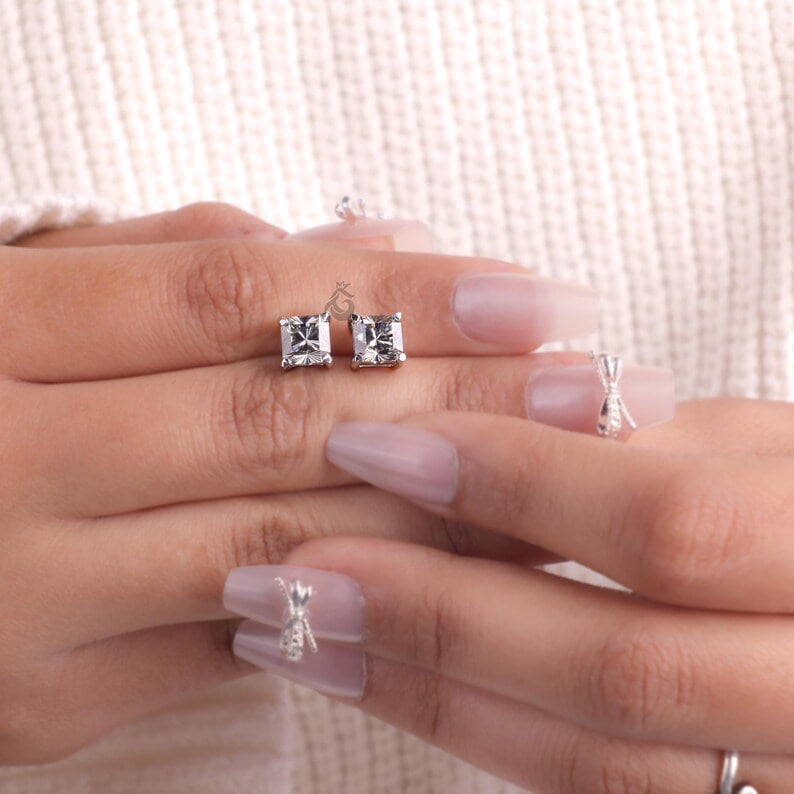 These solitaire diamond stud earrings showcase 2.70 TCW fantasy square shape dark grey moissanite for a bold, modern look. The minimalist design makes them perfect for everyday wear while still making a statement. Set with secure screw backs, they offer both style and comfort. Ideal for gifting or personal collections, these studs suit a range of styles. Available in 925 sterling silver, 10K, 14K, and 18K white, yellow, and rose gold, as well as platinum.