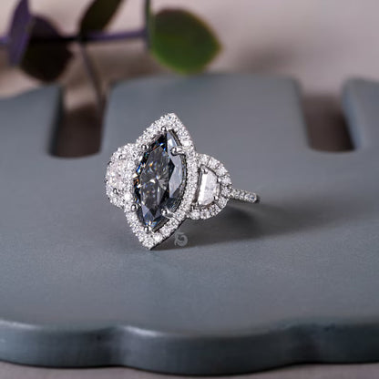 3.5TW Marquise Dark Gray Moissanite Three Stone Ring, 14K White Gold