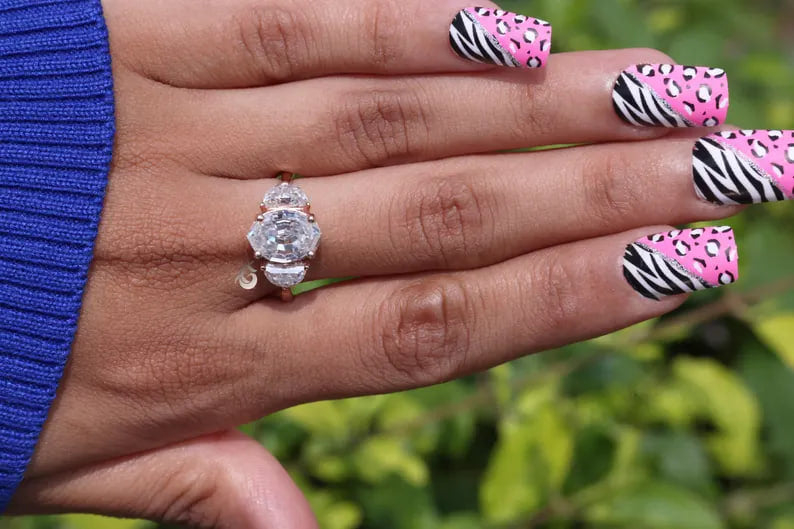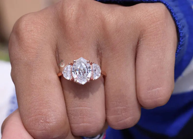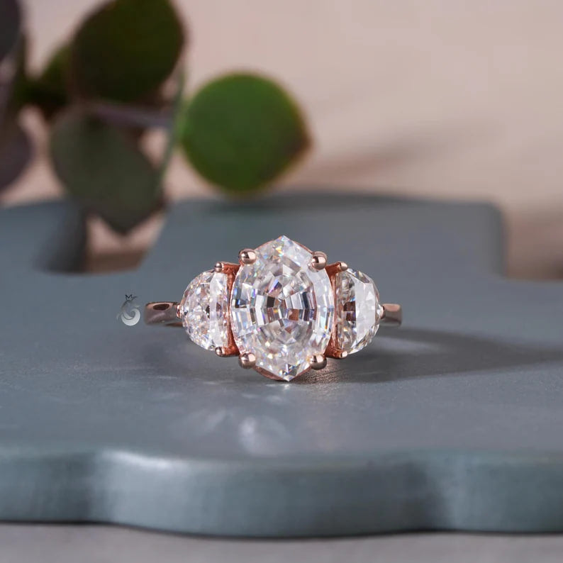 This unique proposal ring combines elegance and symbolism, featuring an antique Old Mine oval cut moissanite as the centerpiece, surrounded by two half-moon cut side stones in a trilogy setting that represents the past, present, and future of your journey together. Perfect for proposals, anniversaries, or as a lasting promise ring, each moissanite stone sparkles with the fire and brilliance of fancy diamonds. Available in high-quality metals like white gold, yellow gold, or platinum, this ring makes a stunning choice for any special occasion and is crafted to be a cherished symbol of timeless love and commitment.