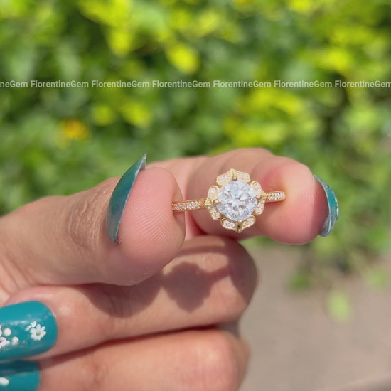 Art Deco 6.5MM Cushion Moissanite Halo Ring, Floral Design, 14K Yellow Gold
