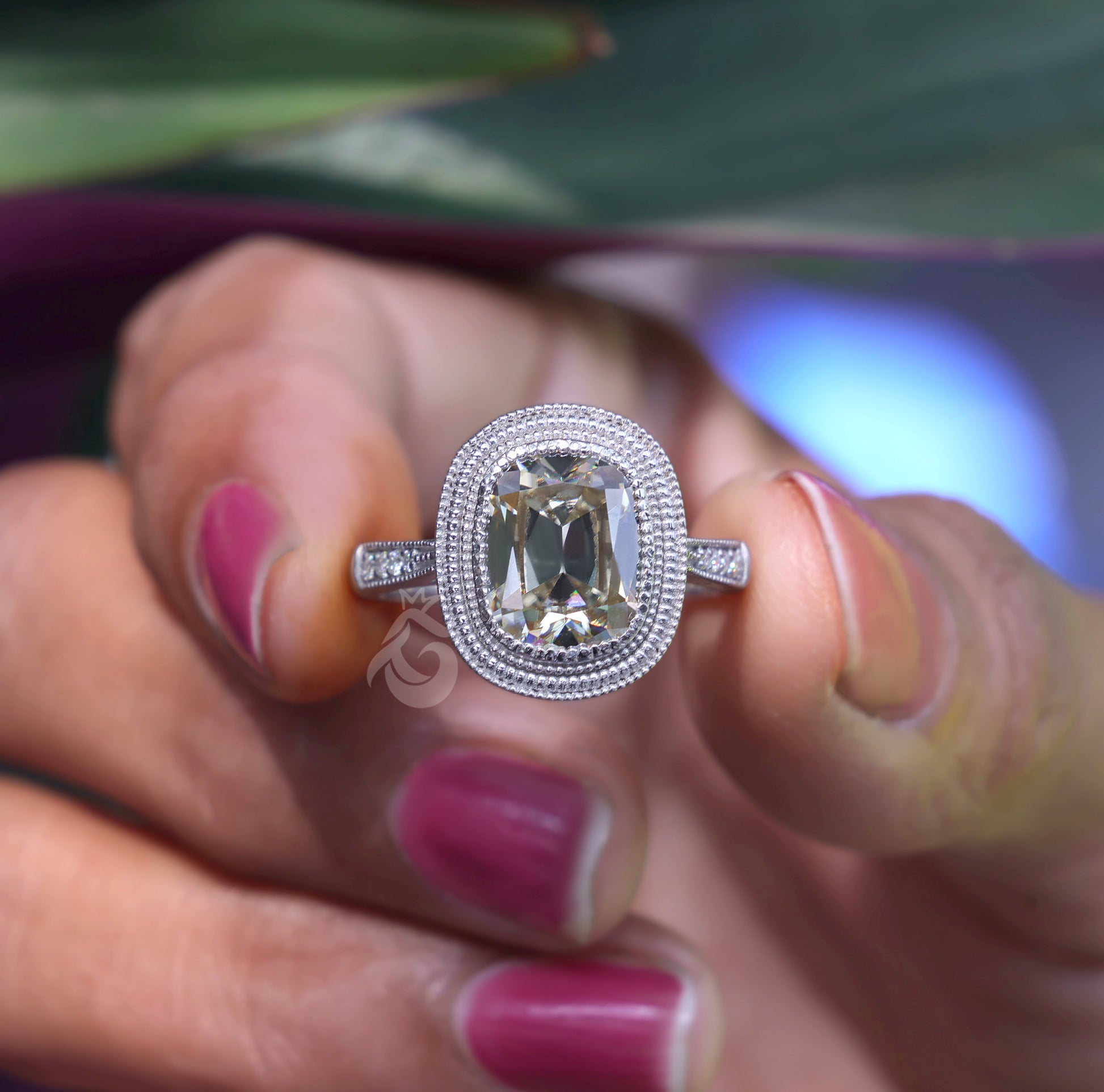 Canary Yellow Cushion Moissanite Engagement Ring, Mil grain Vintage 1920s Style