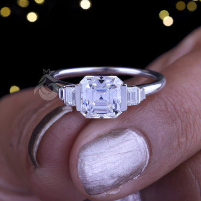 Celebrity Style Asscher & Baguette Moissanite Ring – Five-Stone Half Bezel Engagement & Wedding Ring