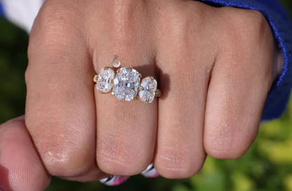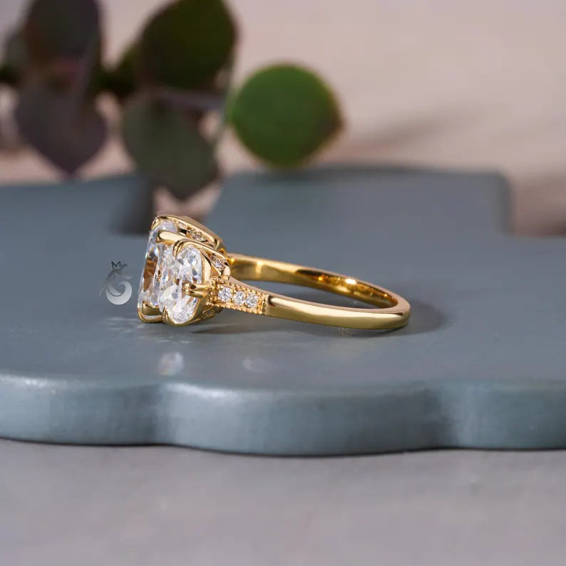 This 2.75-carat old mine cushion-cut moissanite engagement ring showcases a dazzling center stone, beautifully complemented by two side stones, creating a three-stone design symbolizing past, present, and future. Crafted in luxurious 18K yellow gold, the ring features a timeless elegance that pairs classic beauty with a modern touch. Its brilliant moissanite stones offer a stunning sparkle, making it a radiant choice for an engagement, wedding, or anniversary. Ideal for symbolizing a promise or celebrating a cherished moment, this ring is a perfect anniversary or engagement gift for someone special.