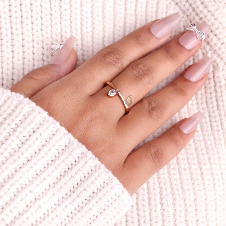This Dainty Charm Dangle Ring features a beautifully cut oval Moissanite diamond set in a sleek bezel setting, offering a modern and elegant look. Crafted in 14K rose gold, the delicate design is enhanced by a charming dangle detail that adds subtle movement and sparkle. Perfect as a solitaire engagement ring, wedding band, or stylish stacking piece, this ring brings a touch of uniqueness to any jewelry collection.