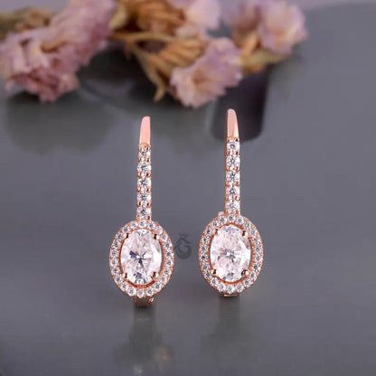 Oval Cut Moissanite Halo Earrings, 14K Rose Gold Dangle Drop Bridal Earrings
