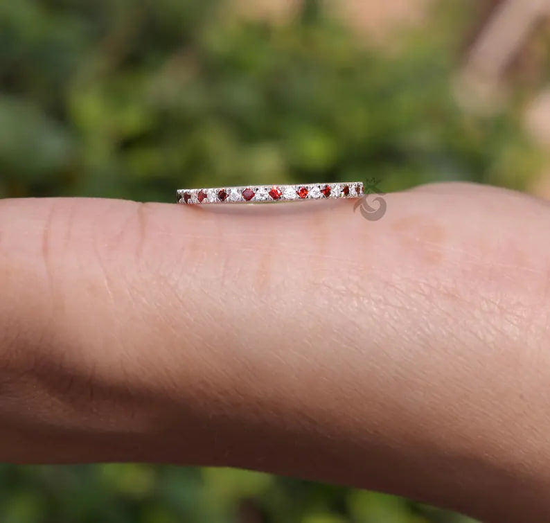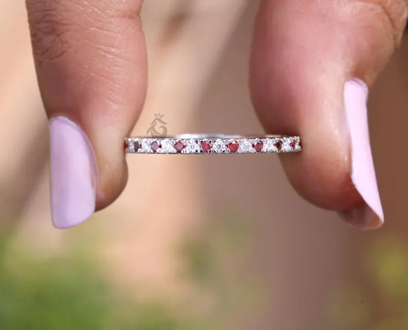 Alternate July Birthstone Ruby and Moissanite Pave set Full Eternity Wedding Band Women Stackable Anniversary Band, Micro pav Matching band