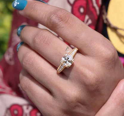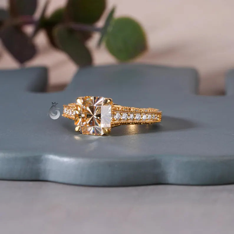 This stunning 2 CT Fantasy Cut Champagne Diamond Ring is a unique and sophisticated choice for those seeking something truly special. The center diamond’s warm champagne hue brings a touch of elegance and individuality, while the fantasy cut enhances its brilliance with a dazzling display of light. Set in luxurious 14k yellow gold, this ring features a three-sided pavé band, adorned with sparkling stones on each side for added depth and radiance. Delicate Mil grain detailing along the edges lends a vintage-inspired charm, creating a balance of classic and contemporary beauty.