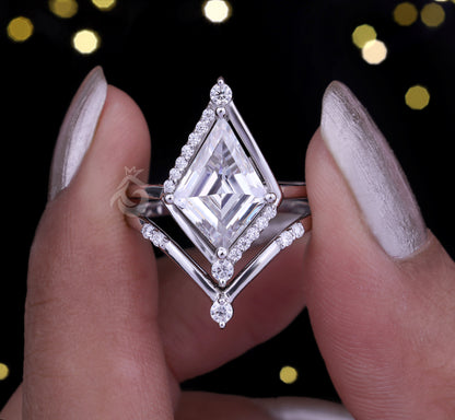 Vintage Kite Cut Moissanite Engagement Ring Set – 14K/18K White Gold Curved Wedding Band