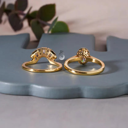 Vintage Oval Moissanite Bridal Ring Set, 18K Yellow Gold Curved Band