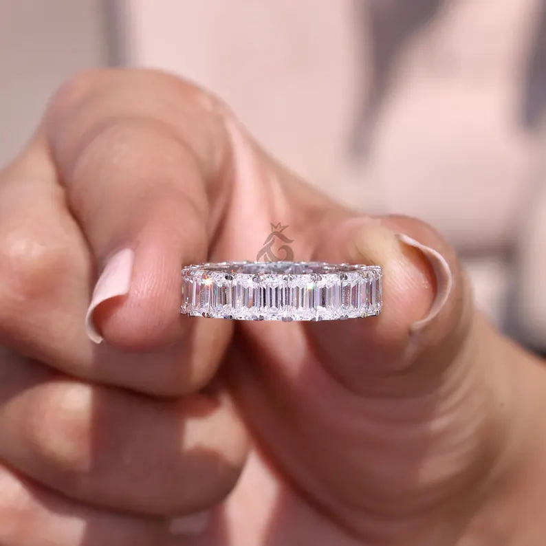 This Unique Prong Set Emerald Cut Moissanite Eternity Ring features a continuous row of brilliant emerald-cut Moissanite stones, offering stunning sparkle from every angle. Set in 14K white gold, this full eternity stackable band is perfect as a wedding band, matching engagement band, or a stand-alone statement piece. The timeless design enhances the beauty of the Moissanite stones, making it a perfect choice for special occasions like weddings and anniversaries.